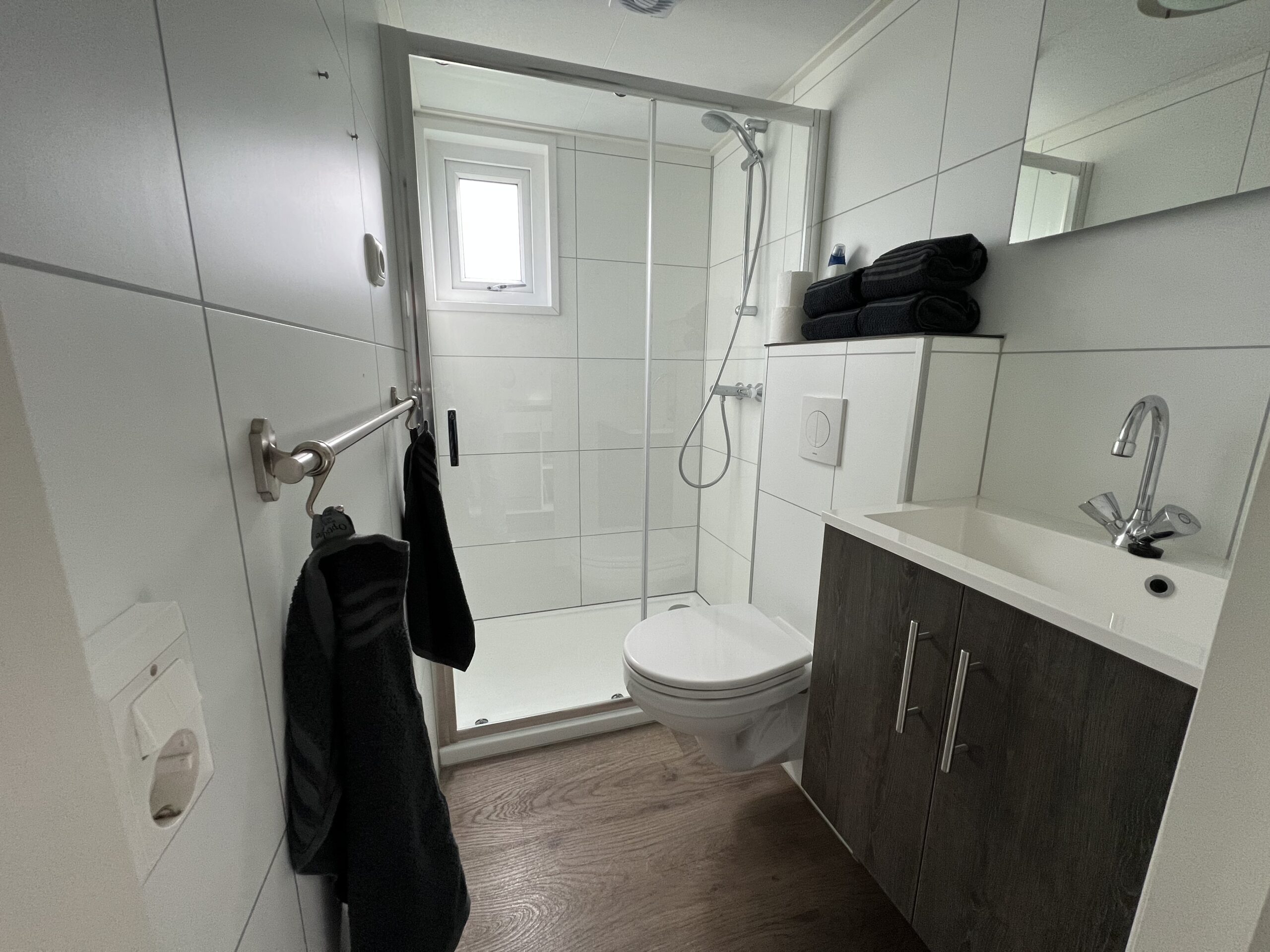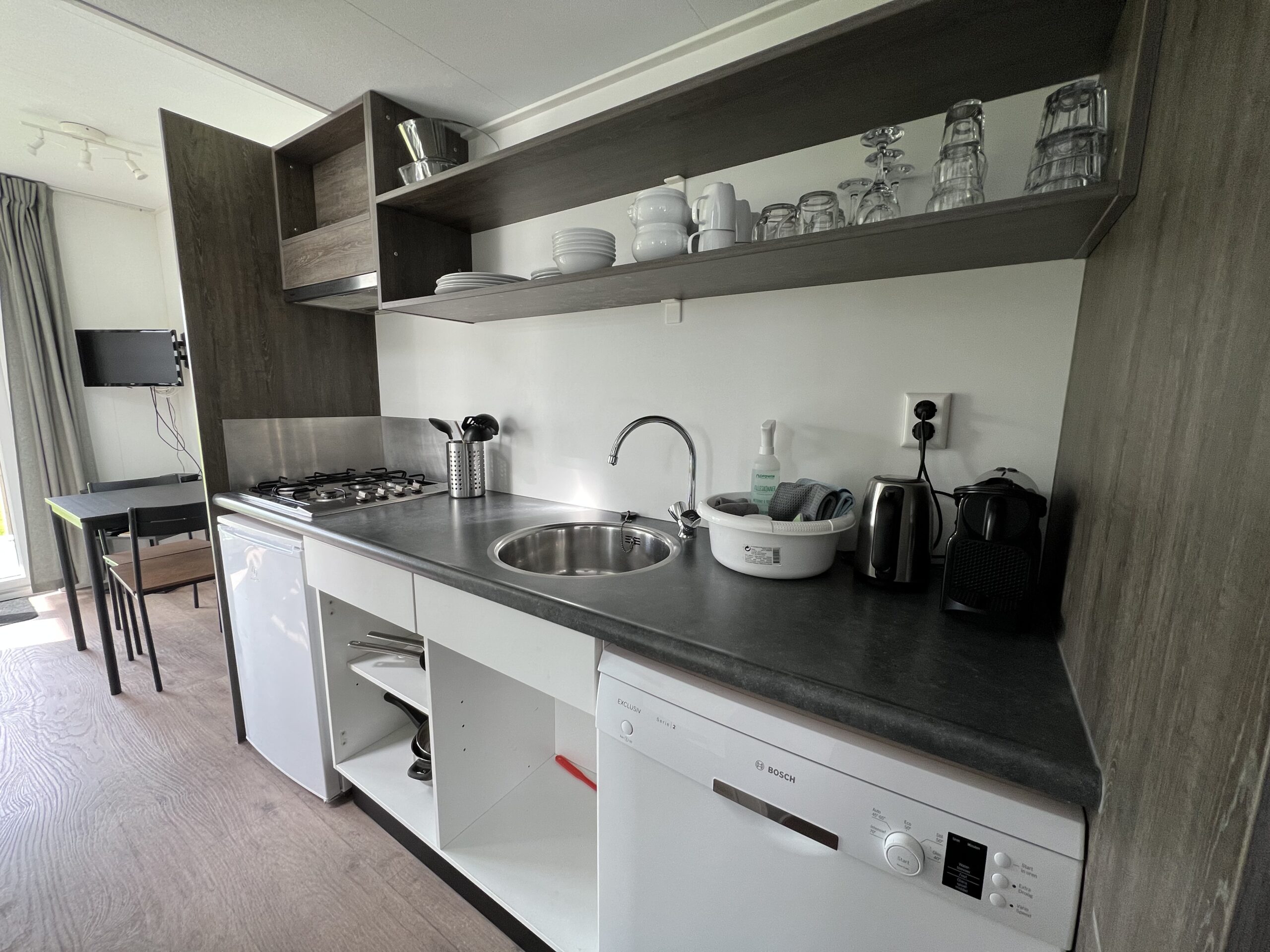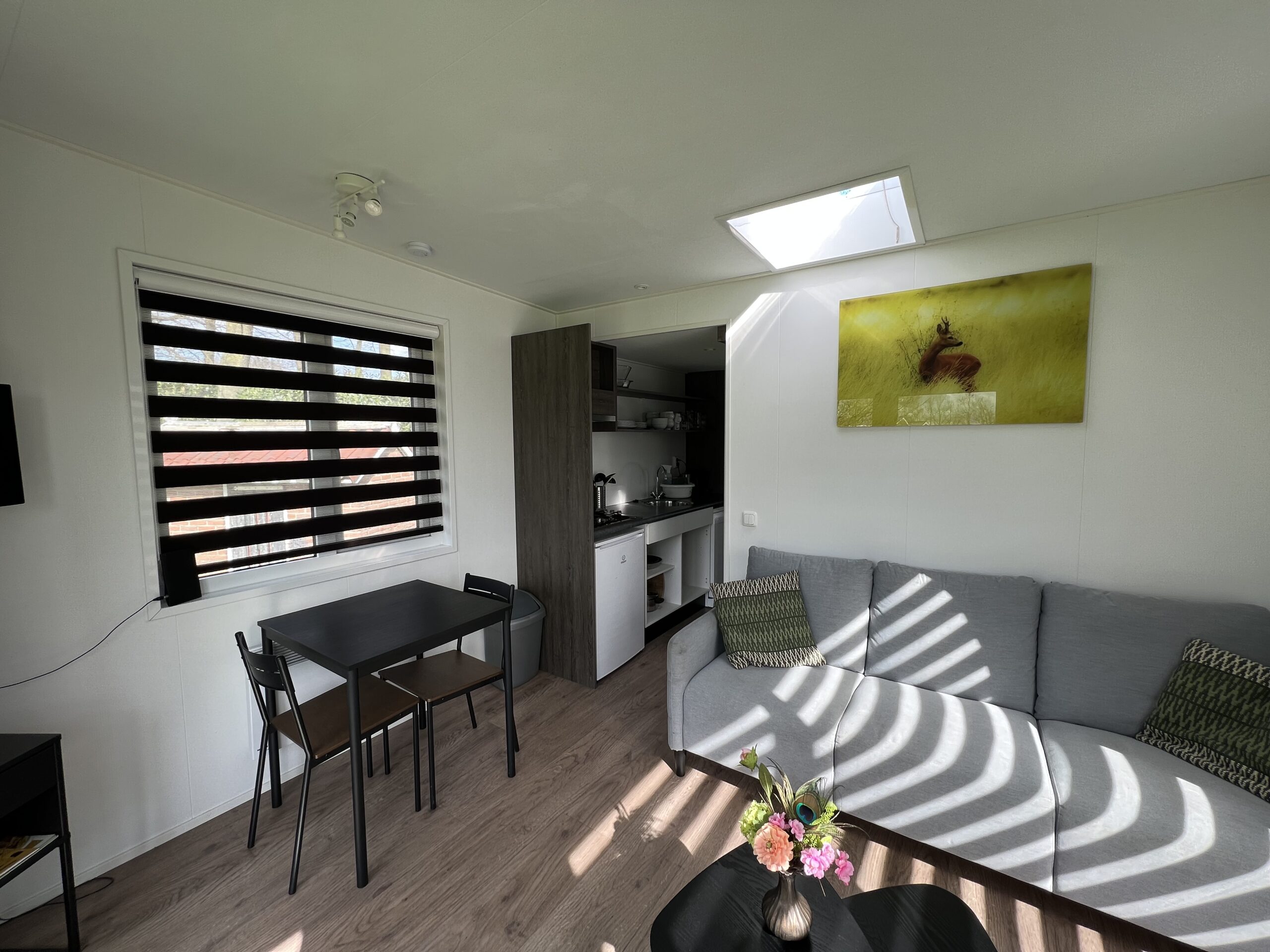 Een tiny house met alle gemakken: een eigen badkamer, een volledig ingerichte keuken en een comfortabele zithoek. Hier heeft u de luxe van thuis, maar met de charme van een kleine camping.